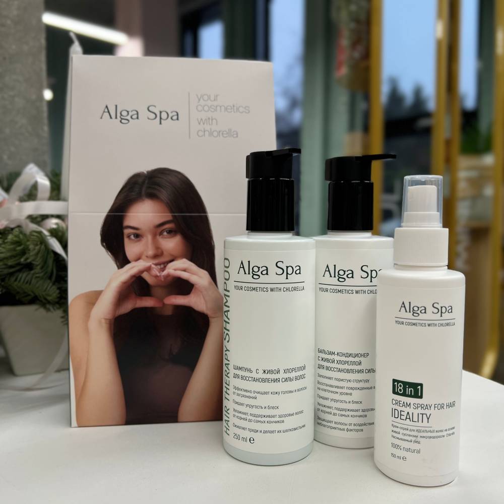 В набор входит: Шампунь с живой хлореллой для восстановления силы волос, 250 мл, Alga Spa; Крем-спрей для идеальных волос на основе микроводоросли Хлорелла Alga Spa; Бальзам-кондиционер с живой хлореллой для восстановления силы волос, 250 мл, Alga Spa; Подарочная упаковка; Наша фирменная открытка.